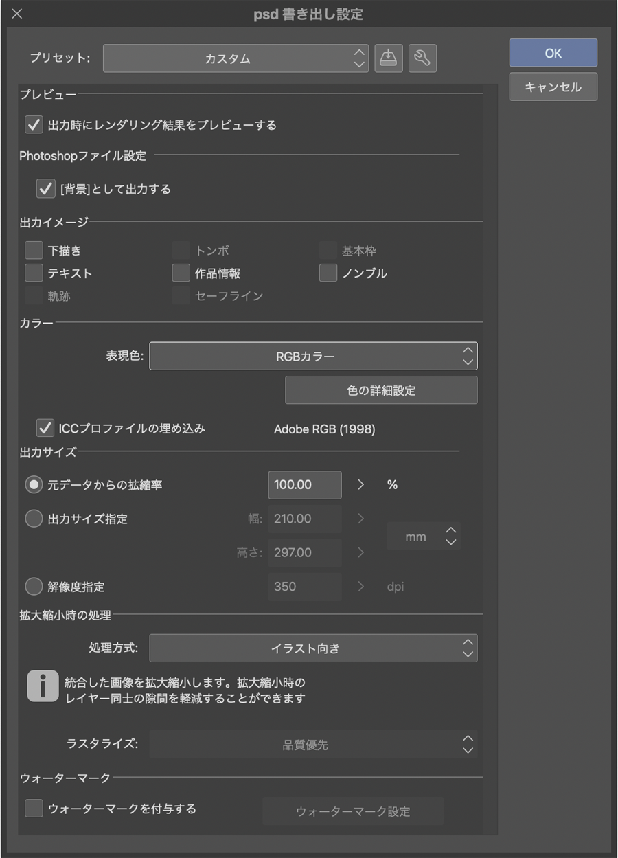 - 保存の際は、表現色を「RGBカラー」にして「ICCプロファイルの埋め込み」にチェックをつけて保存してください。